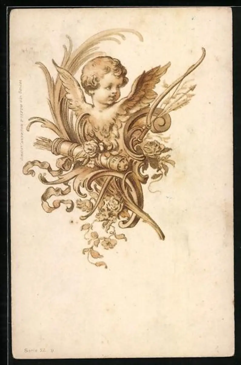 Lithographie Kleiner Amor mit Pfeil und Bogen
