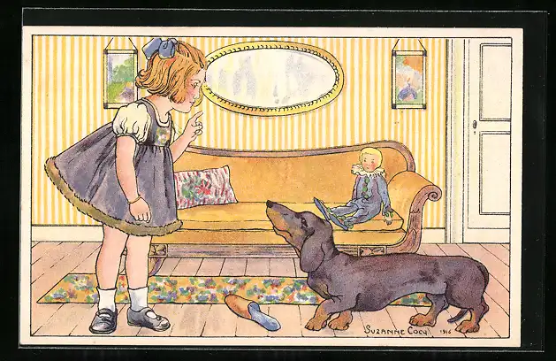 Lithographie Kleines Mädchen mit Dackel und Puppe in der Stube