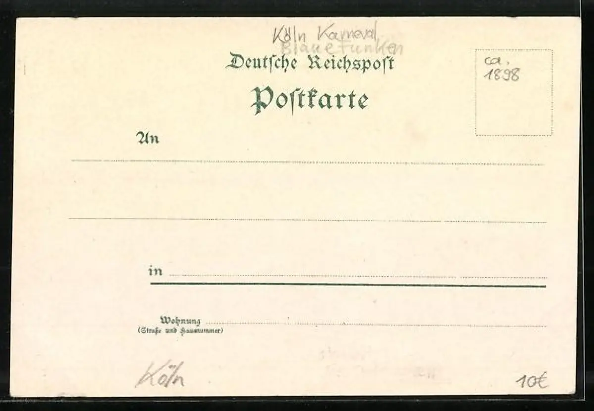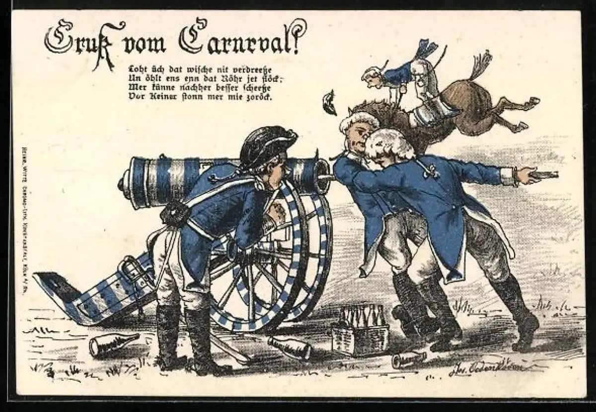 Lithographie Köln, Blaue Funken mit einer Kanone, Grüsse vom Carneval