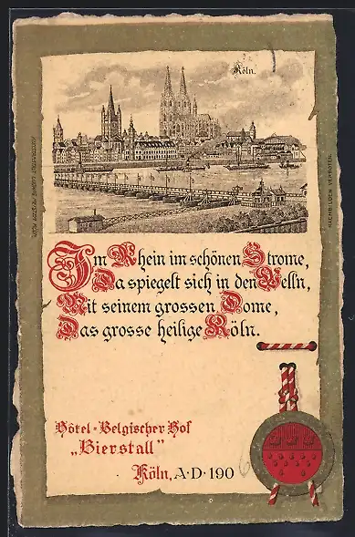 Lithographie Köln, Blick auf Rheinbrücke und Dom