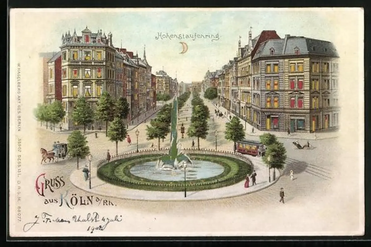 Lithographie Köln a. Rh., Hohenstaufenring mit Strassenbahn, Halt gegen das Licht