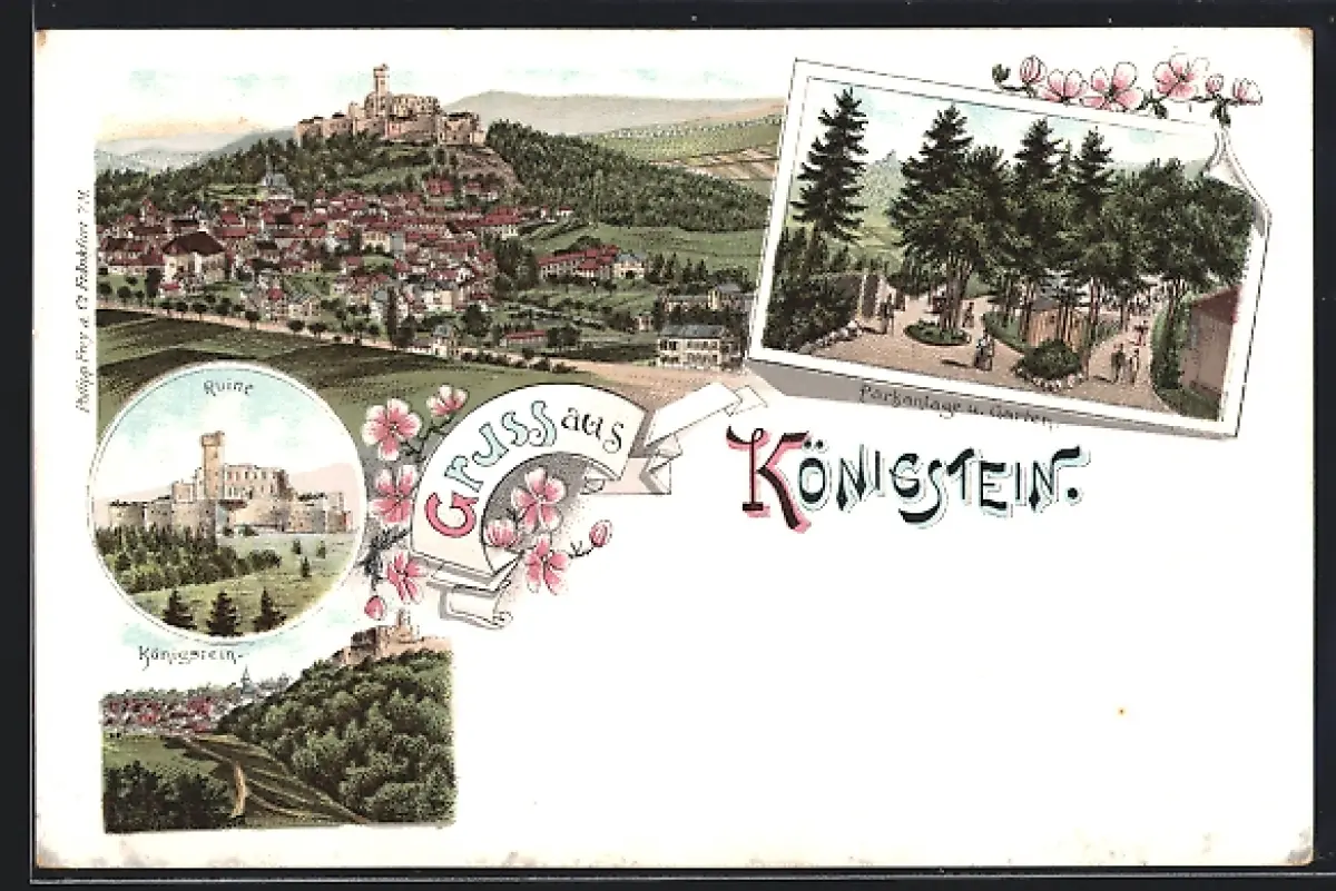 Lithographie Königstein i. T., Totalansicht mit Ruine, Parkanlagen und Garten