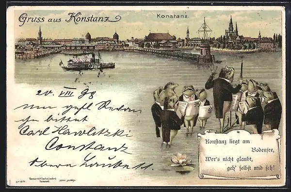 Lithographie Konstanz, vermenschlichter Frösche-Chor mit Totalansicht vom Ort