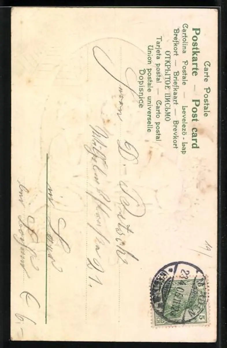 Personenbezogene Daten auf der Rückseite der Karte wurden durch blauen Textmarker unkenntlich gemacht. Die blauen Stellen sind auf die Vorderseite durchgeweicht und wirken sich negativ auf das Postkartenfoto aus