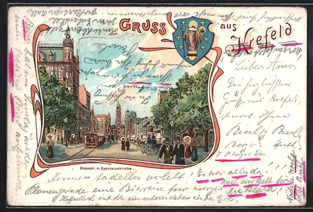 Lithographie Krefeld, Rheinstrasse mit Dionisiuskirche