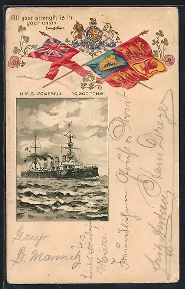 Lithographie Kriegsschiff H.M.S. Powerful, Flaggen