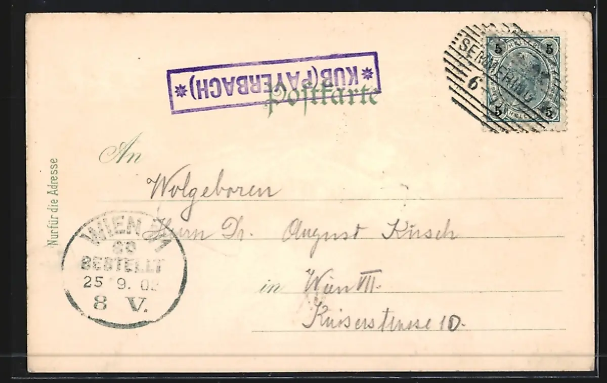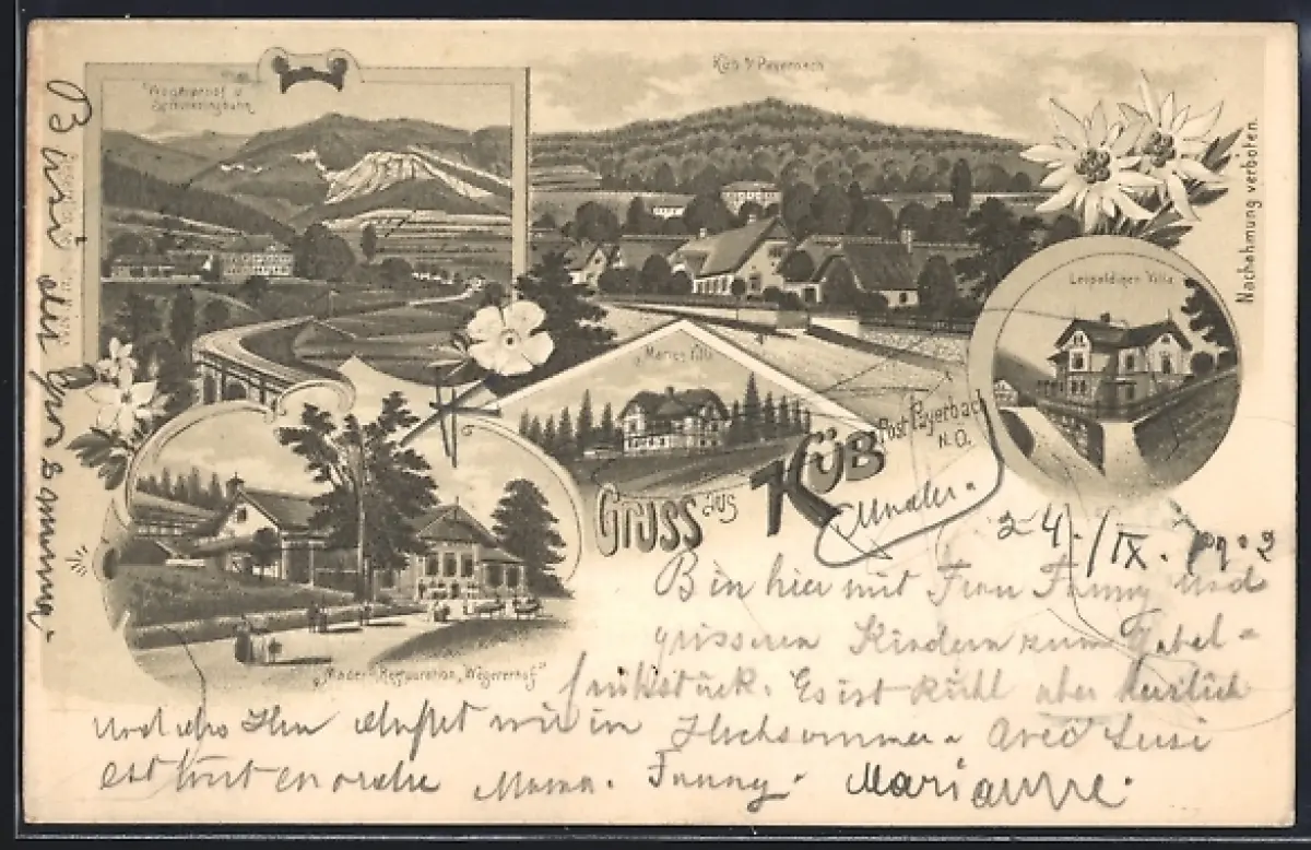 Lithographie Küb /N. Ö., Maders Restauration Wegererhof, Marien-Villa, Leopoldinen-Villa, Ortsansicht