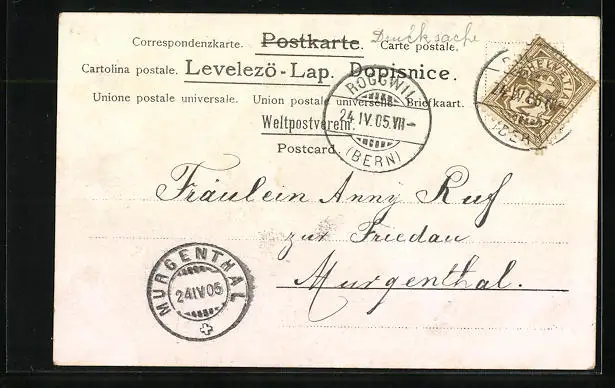 Personenbezogene Daten auf der Rückseite der Karte wurden durch blauen Textmarker unkenntlich gemacht. Die blauen Stellen sind auf die Vorderseite durchgeweicht und wirken sich negativ auf das Postkartenfoto aus