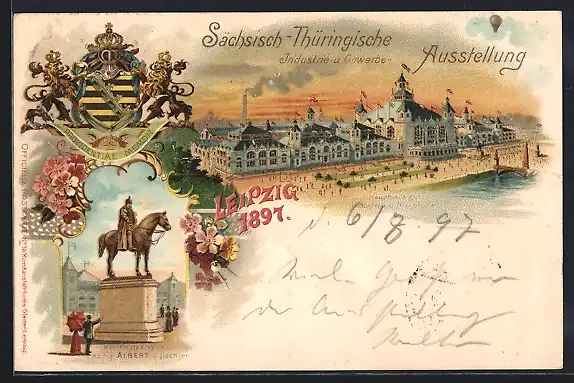 Lithographie Leipzig, Sächs.-Thüringische Industrie- u. Gewerbe-Ausstellung 1897, Wappen, Ballon, Denkmal, Halle