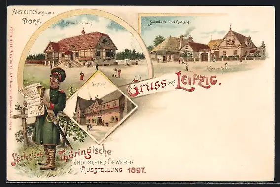 Lithographie Leipzig, Sächsisch-Thüringische Industrie- und Gewerbe-Ausstellung 1897, Gasthof, Mann verkündet Botschaft
