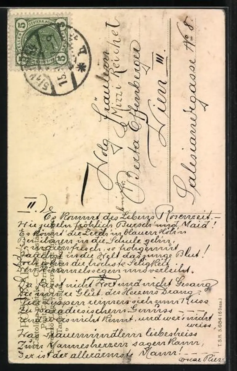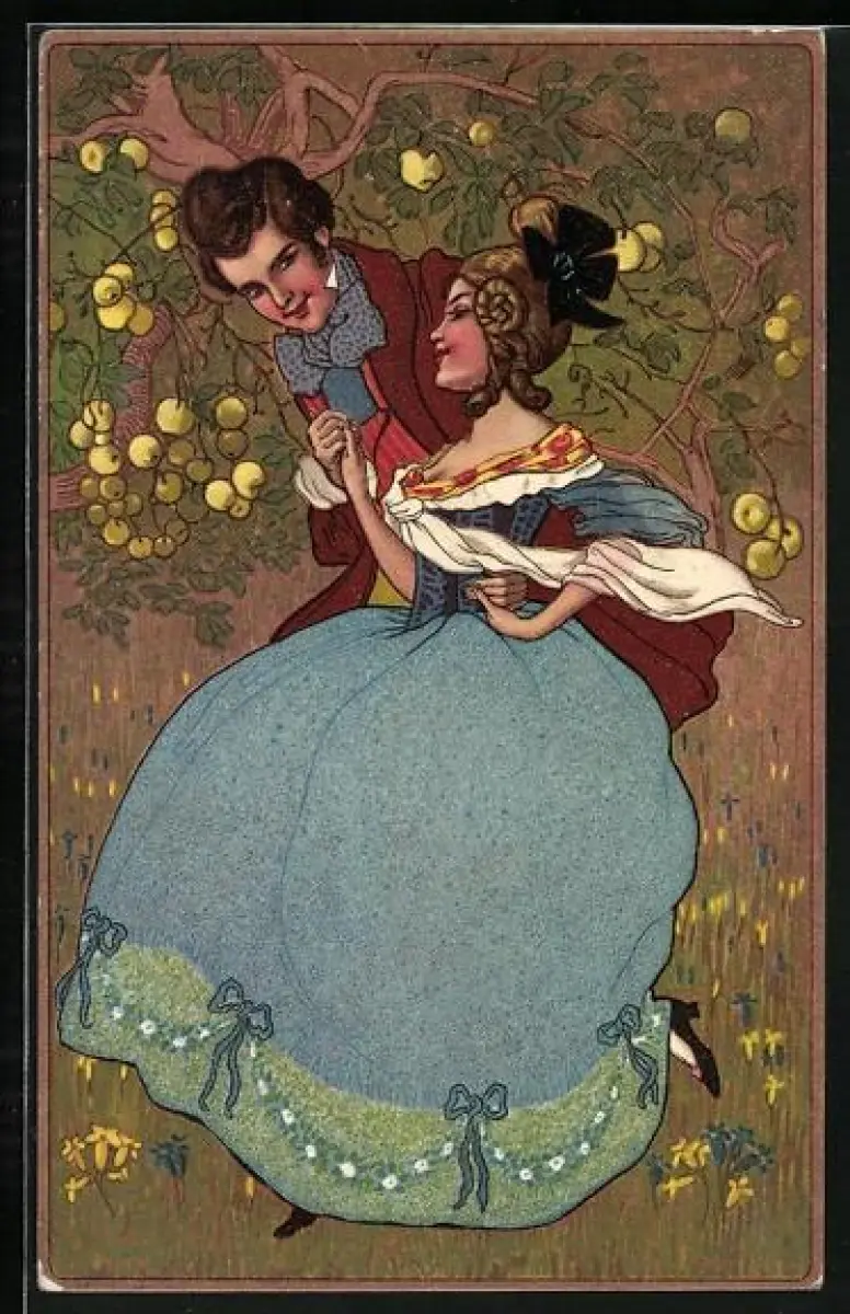 Lithographie Liebespaar unter Apfelbaum, Biedermeier