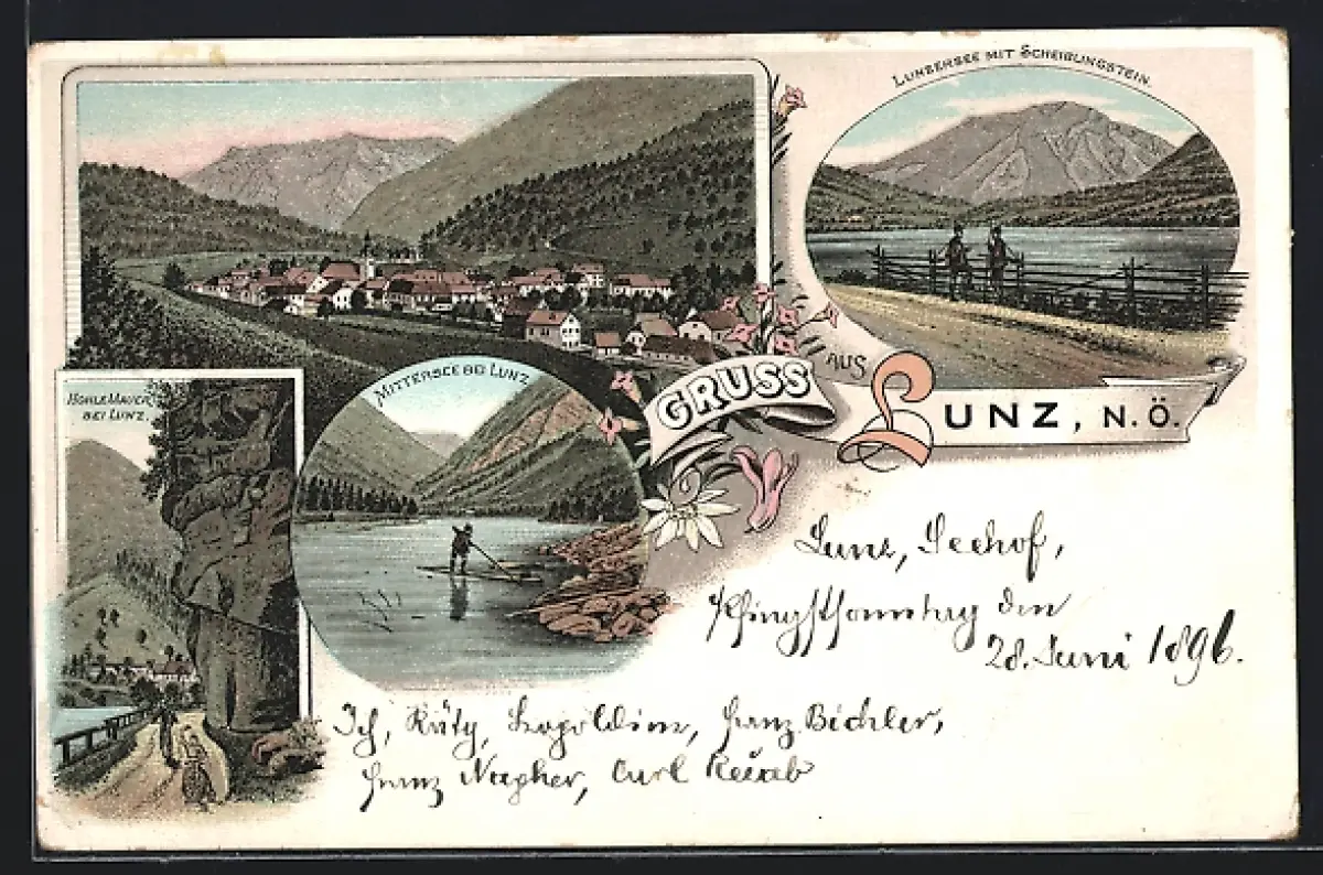 Lithographie Lunz /N. Ö., Lunzersee mit Scheiblingstein, Mittersee, Hohle Mauer