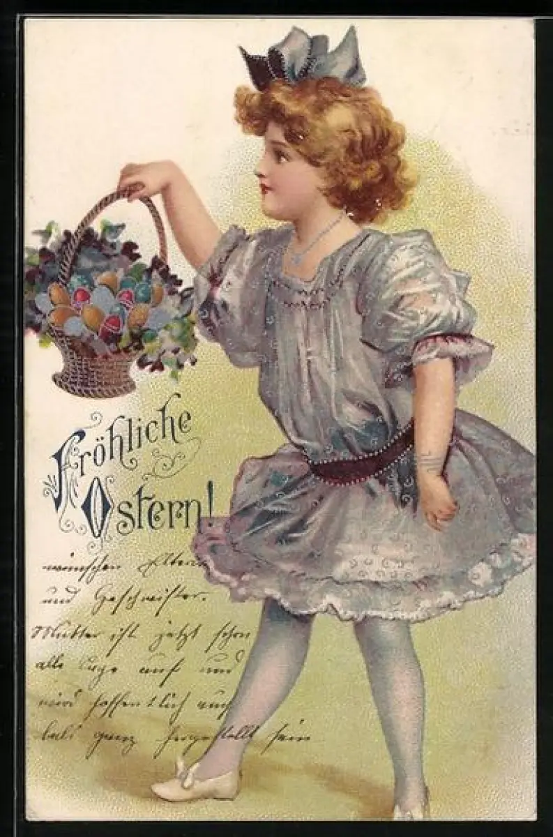 Lithographie Mädchen mit Blumenkorb mit Ostereiern, Fröhliche Ostern