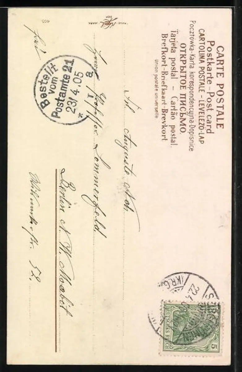 Personenbezogene Daten auf der Rückseite der Karte wurden durch blauen Textmarker unkenntlich gemacht. Die blauen Stellen sind auf die Vorderseite durchgeweicht und wirken sich negativ auf das Postkartenfoto aus