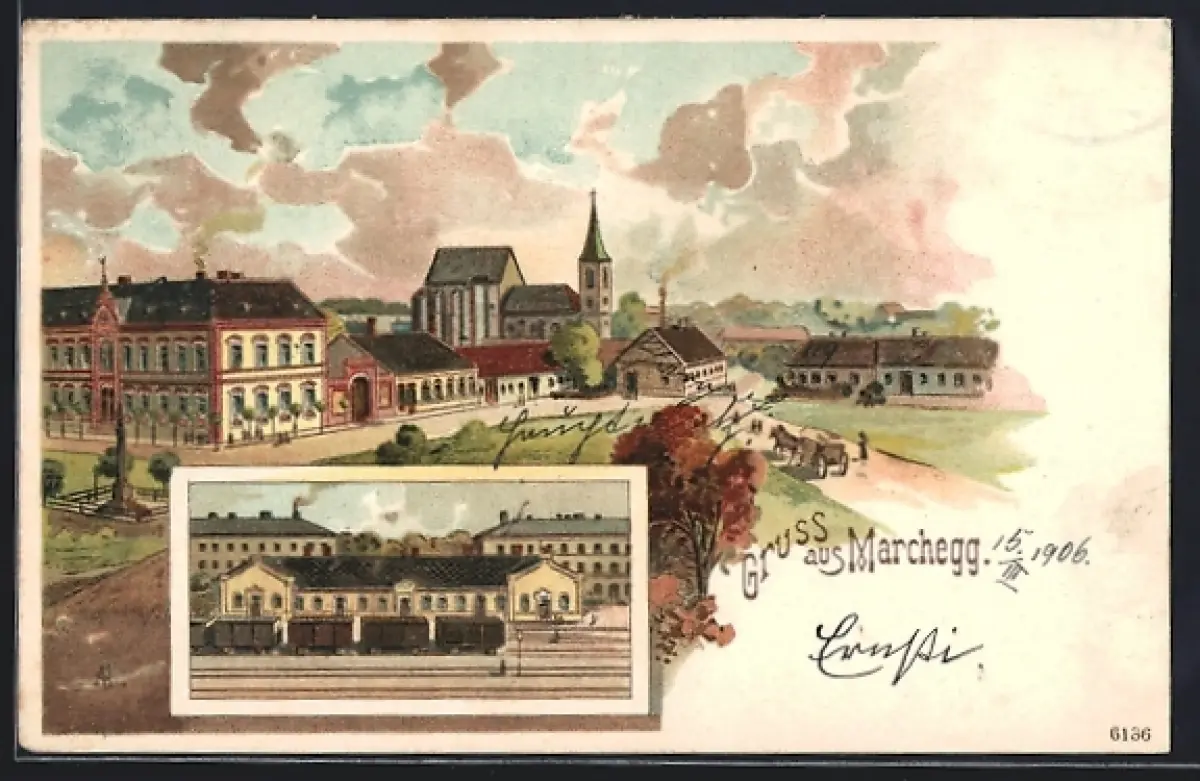 Lithographie Marchegg, Ortsansicht von oben, Bahnhof, Eisenbahnwaggons