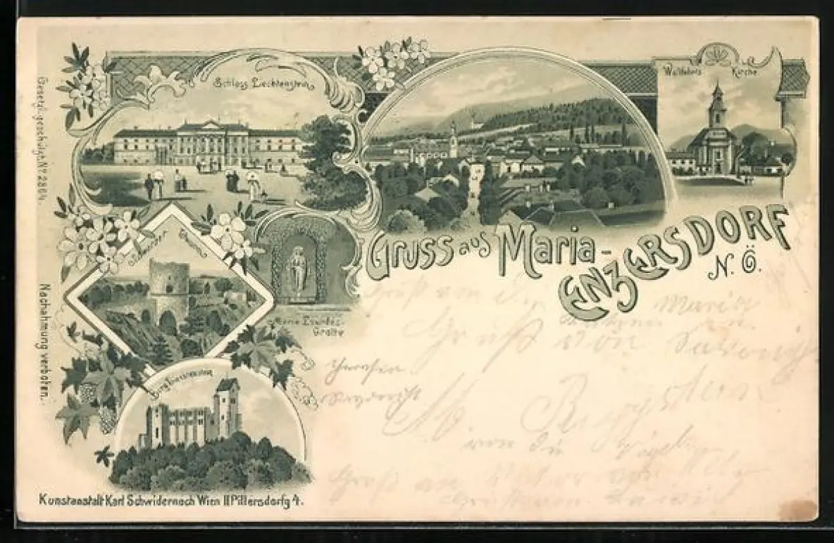 Lithographie Maria-Enzersdorf /N. Ö., Schloss Liechtenstein, Wallfahrtskirche, Schwarzer Thurm, Burg