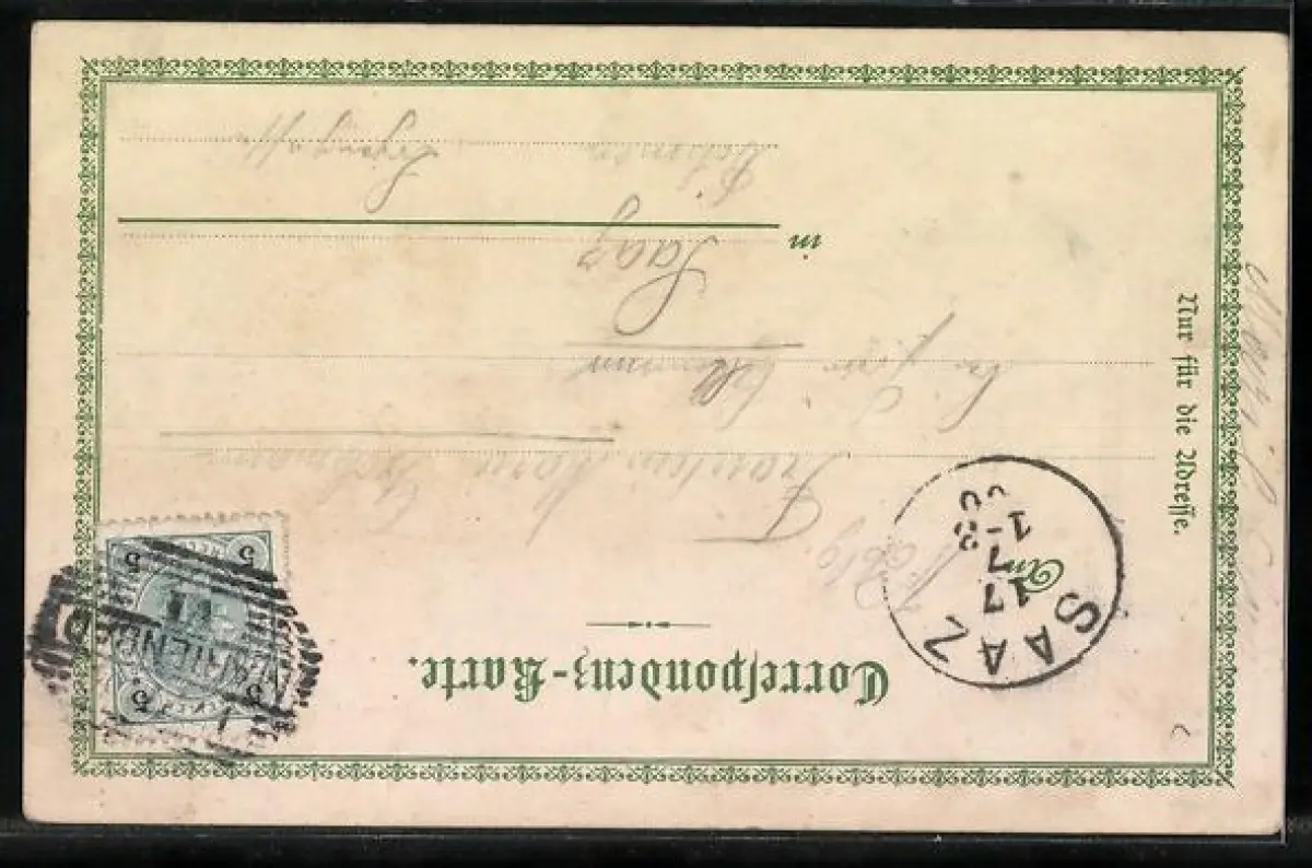Personenbezogene Daten auf der Rückseite der Karte wurden durch blauen Textmarker unkenntlich gemacht. Die blauen Stellen sind auf die Vorderseite durchgeweicht und wirken sich negativ auf das Postkartenfoto aus