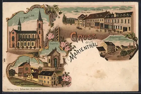 Lithographie Marienthal, Gasthäuser zur Glocke, zum Wilden Mann, zum Pflug, Hotel zum Engel, Basilika, Kapelle