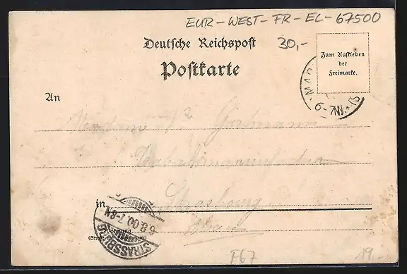 gelaufen 1900, Briefmarke entfernt, Eckknick re. oben, guter Zustand