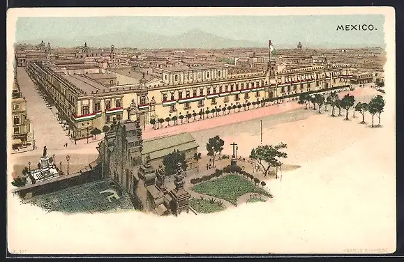 Lithographie Mexico-Stadt, Panorama aus der Vogelschau