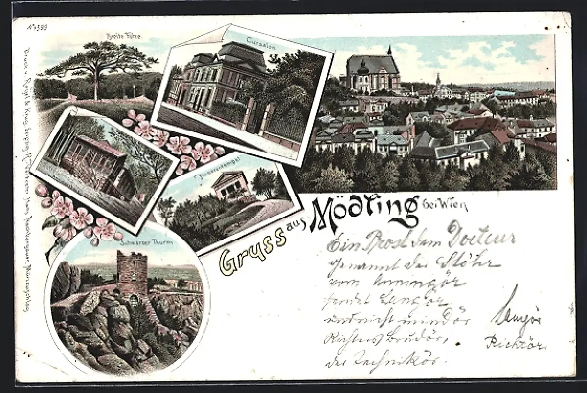 Lithographie Mödling, Ortsansicht von oben, Cursalon, Breite Föhre, Husarentempel