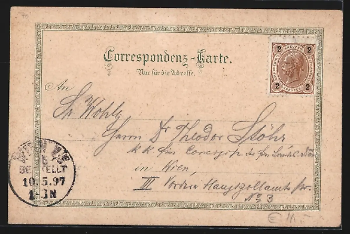gelaufen 1897, Eckknick links unten, Bugspur links oben, sonst guter Zustand