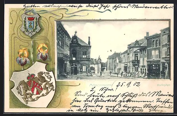 Lithographie Mörchingen, Marktplatz mit Geschäft u. Kindergruppe, Wappen, Blumen, Passepartout