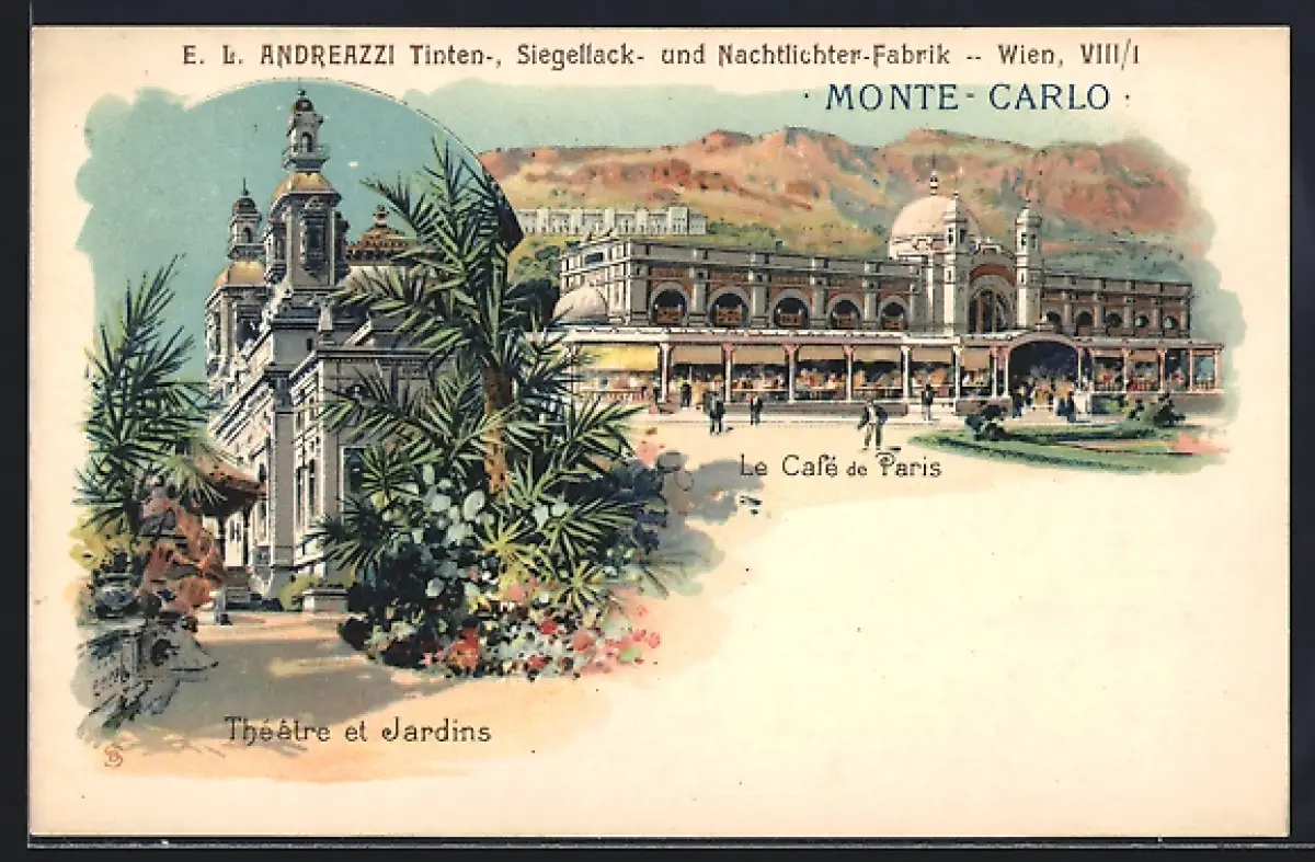Lithographie Monte-Carlo, Le Café du Paris, Théâtre et Jardins