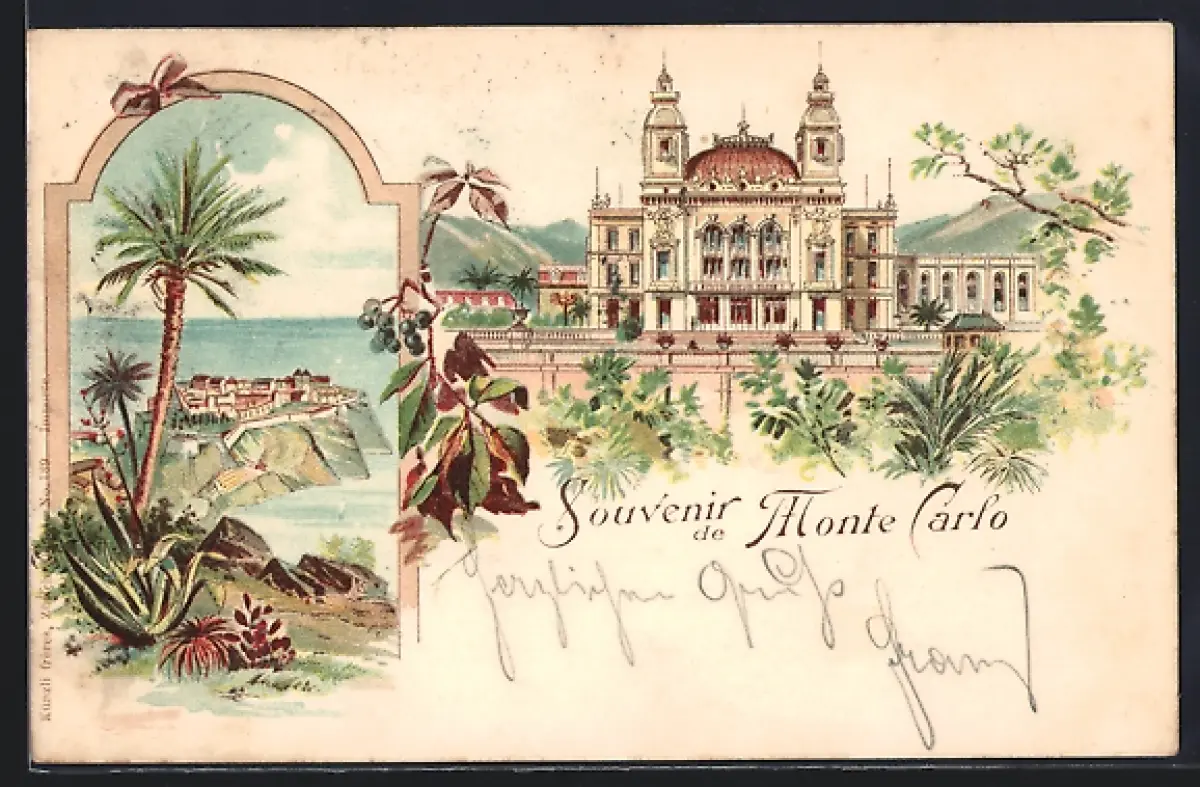 Lithographie Monte Carlo, Ortspartie, Herrschaftliches Gebäude