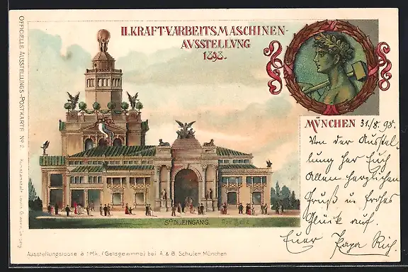 Lithographie München, II. Kraft- und Arbeitsmaschinen-Ausstellung 1898, Südlicher Eingang