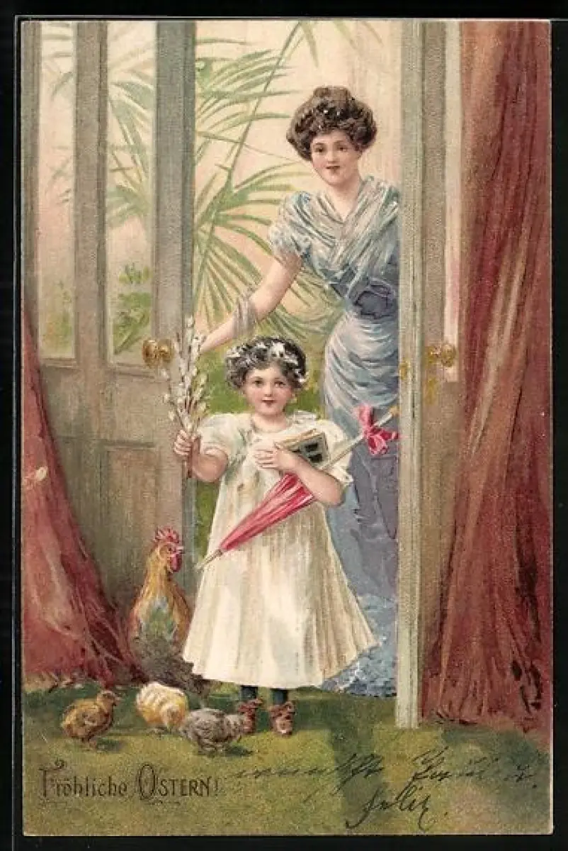 Lithographie Mutter und Tochter nach Spaziergang mit Osterküken, Fröhliche Ostern