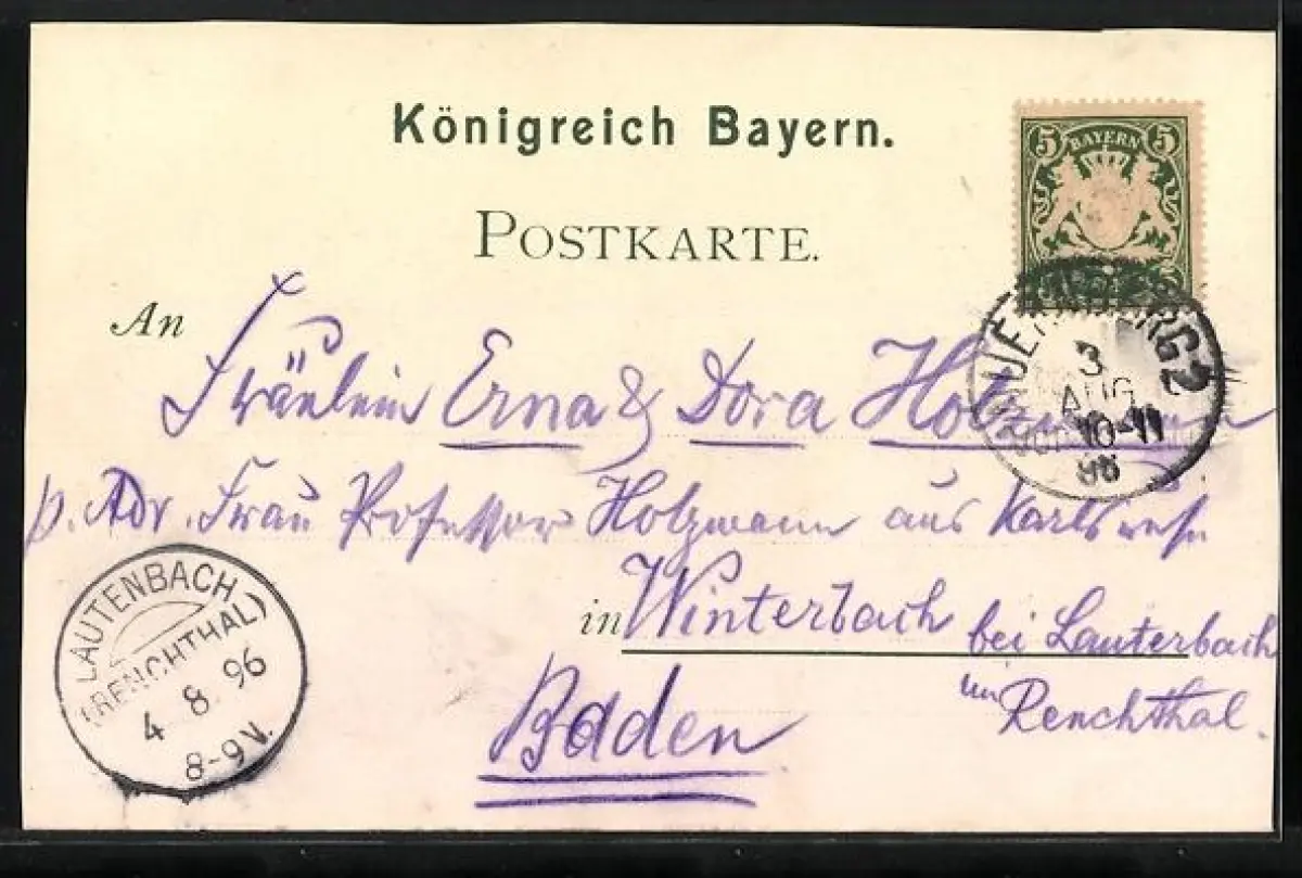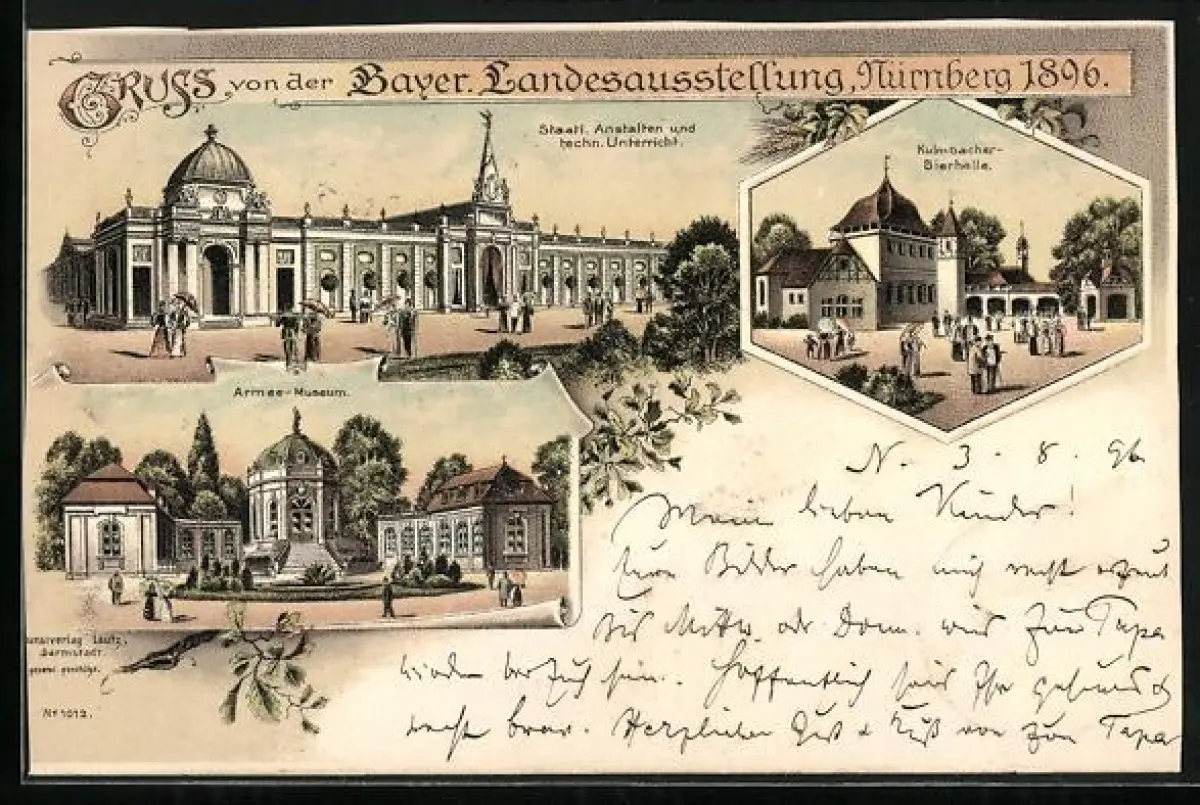 Lithographie Nürnberg, Bayer. Landes-Ausstellung 1896, Kulmbacher-Bierhalle, Staatl. Anstalten, Armee-Museum