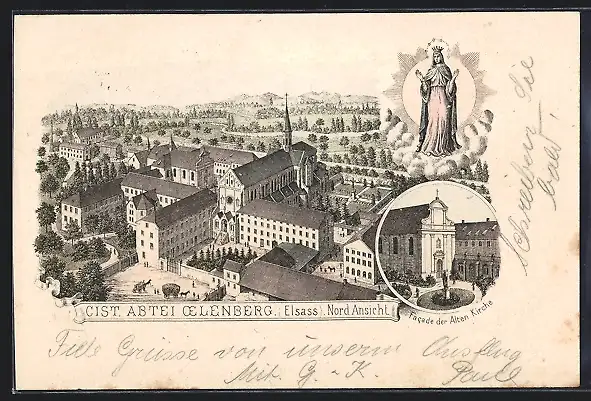 Lithographie Oelenberg, Cistercienser-Abtei Oelenberg, Gesamtansicht, Facade der alten Kirche, Marienerscheinung