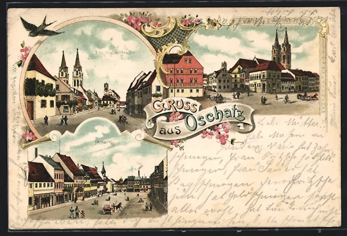 Lithographie Oschatz, Altmarkt, Strassenpartie