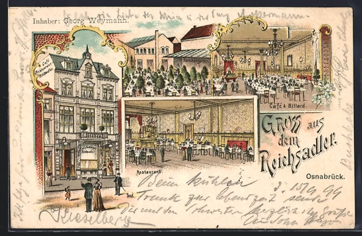 Lithographie Osnabrück, Gasthaus Reichsadler, Inh. Georg Weymann, Café & Billard