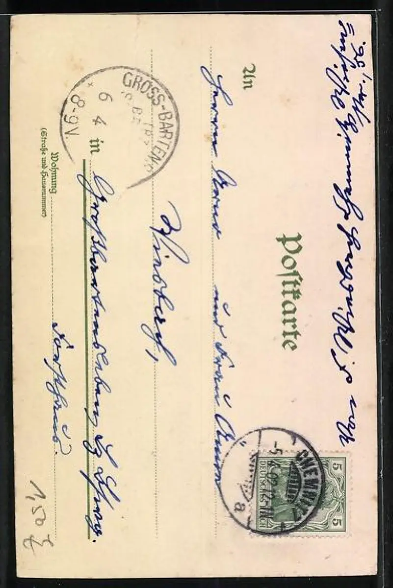 Personenbezogene Daten auf der Rückseite der Karte wurden durch blauen Textmarker unkenntlich gemacht. Die blauen Stellen sind auf die Vorderseite durchgeweicht und wirken sich negativ auf das Postkartenfoto aus
