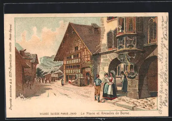 Lithographie Paris, Exposition universelle de 1900, La Place et Arcades de Berne