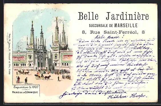 Lithographie Paris, Exposition universelle de 1900, Palais de la Céramique, Belle Jardinière, 8, Rue Saint-Ferréol