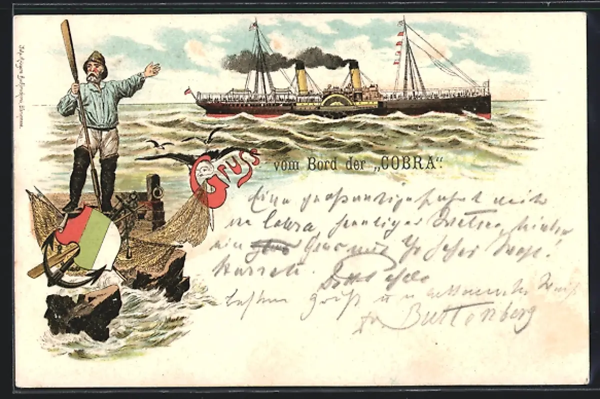 Lithographie Passagierschiff Cobra auf hoher See, Wappen