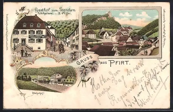 Lithographie Pfirt, Gasthof zum Storchen von J. Pfiffer, Bahnhof