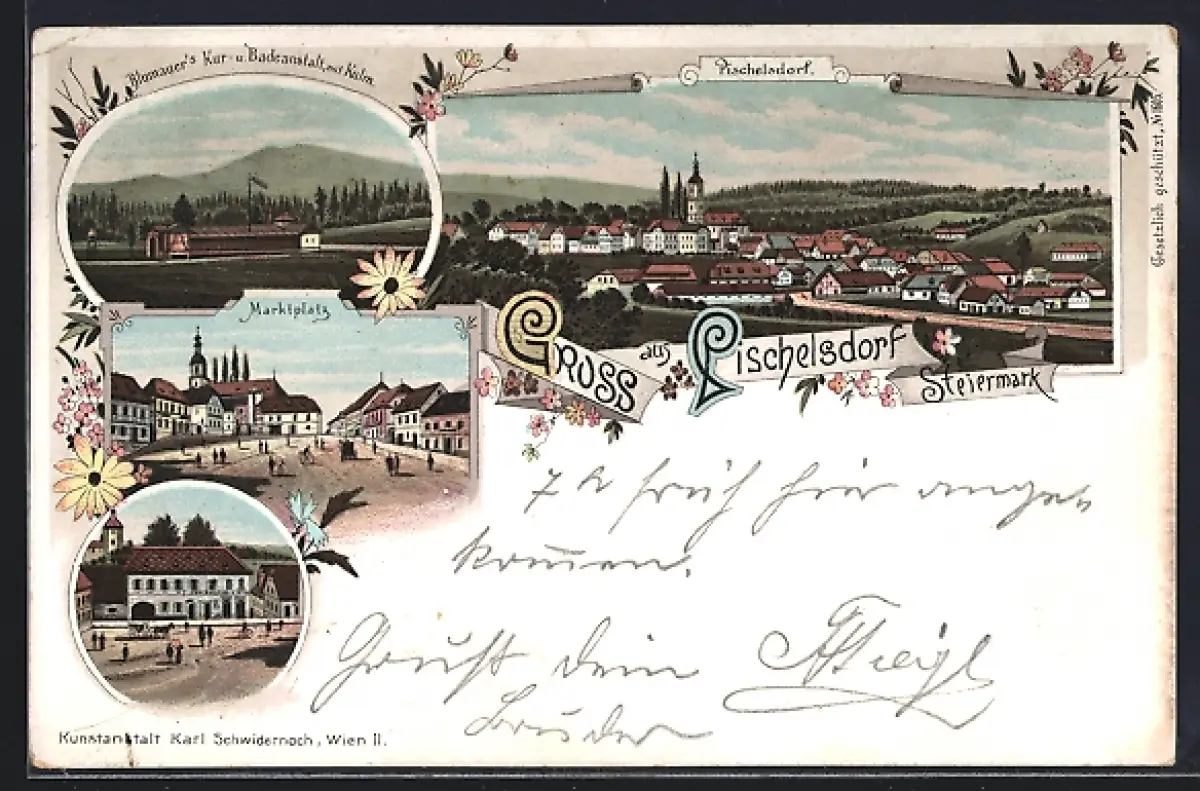 Lithographie Pischelsdorf /Steiermark, Ortsansicht mit Kirche, Blumauer`s Kur- u. Badeanstalt mit Kulm, Marktplatz