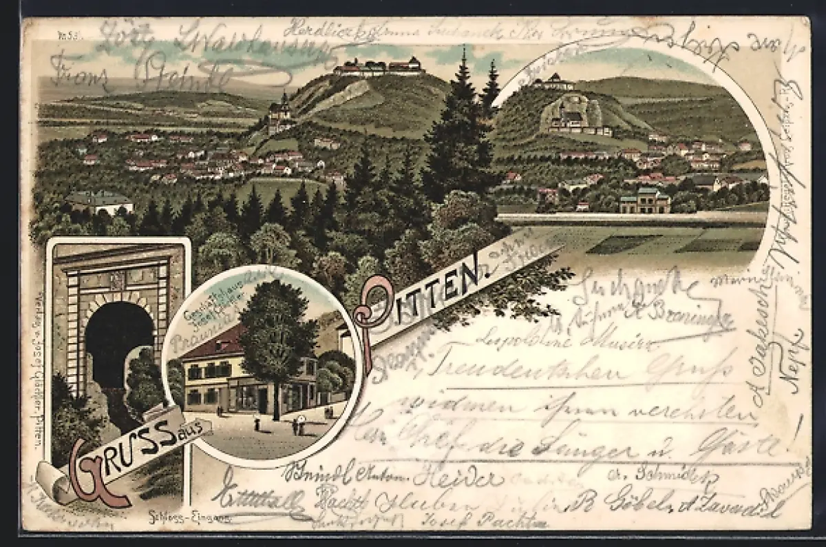 Lithographie Pitten, Schloss-Eingang, Geschäftshaus Josef Glöckler