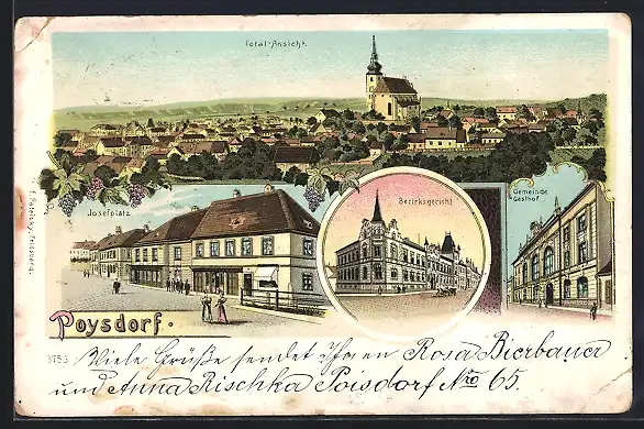Lithographie Poysdorf, Gemeinde-Gasthof, Bezirksgericht, Josefplatz
