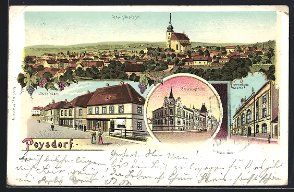 Lithographie Poysdorf, Gemeinde-Gasthof, Bezirksgericht, Josefplatz