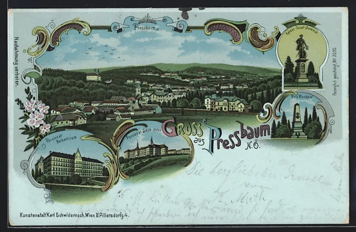 Lithographie Pressbaum, Pensionat Norbertinum, Pensionat Sacre coer, Kaiser-Josef-Denkmal
