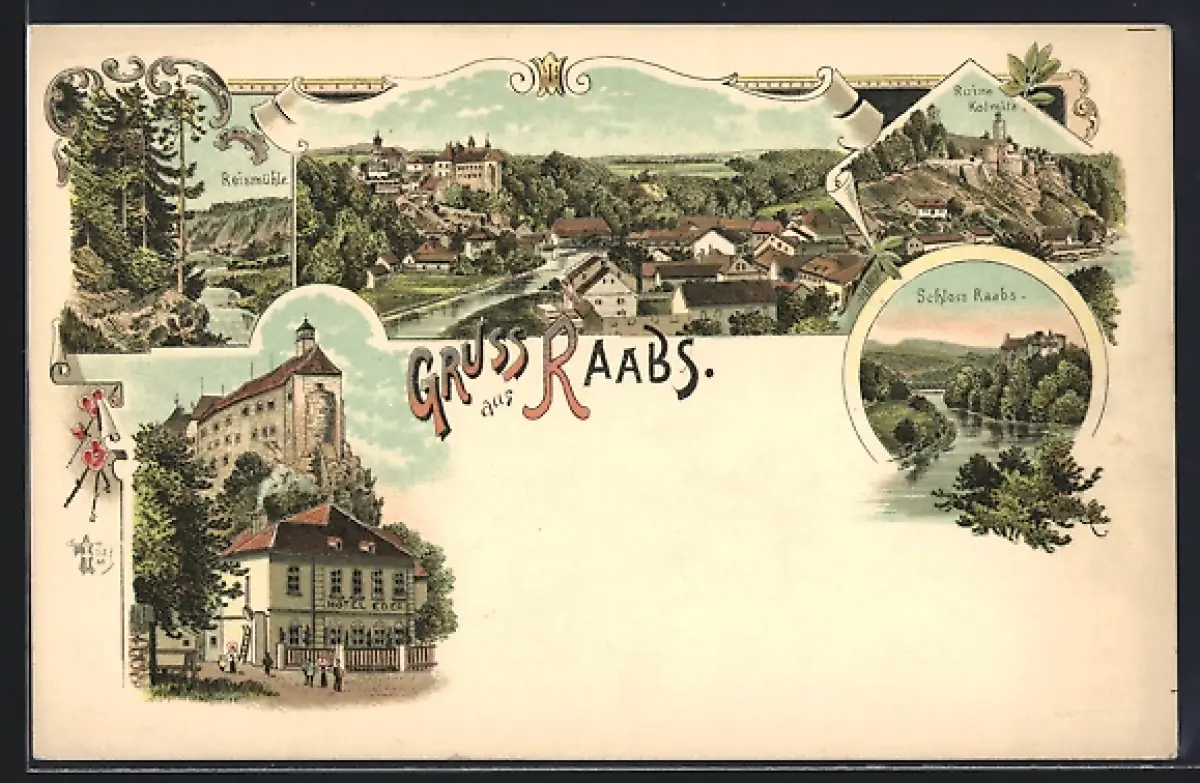Lithographie Raabs, Hotel Eder, Schloss Raabs, Ruine Kolmitz, Reismühle