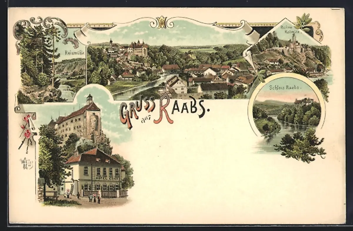 Lithographie Raabs, Reismühle, Schloss Raabs, Ruine Kolmitz