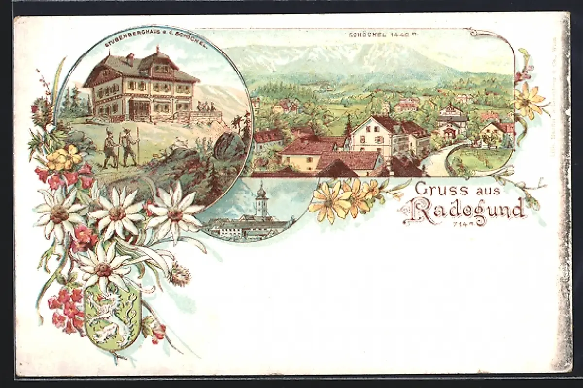 Lithographie Radegund am Schröckel, Gasthaus Stubenberghaus a. d. Schöckl, Ortsansicht mit Schöckl