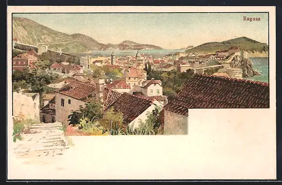 Lithographie Ragusa, Blick über die Dächer