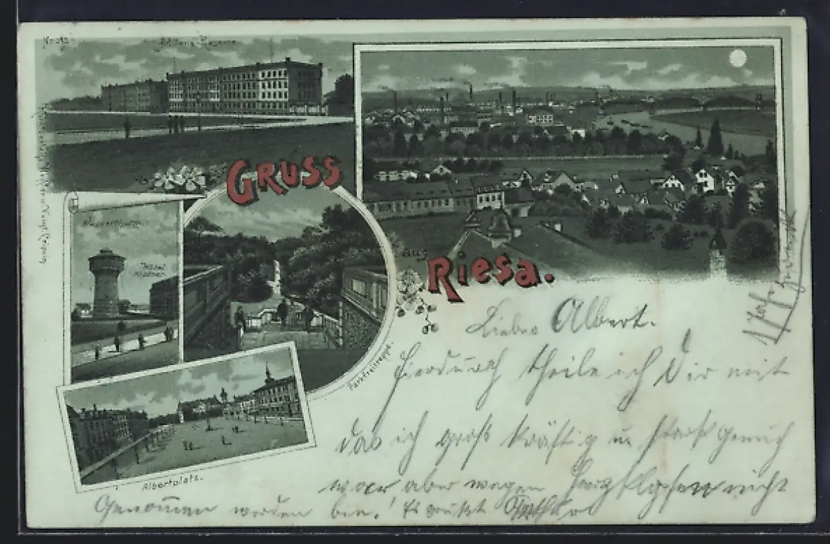 Lithographie Riesa, Hotel Höpfner und Wasserturm, Artillerie-Kaserne